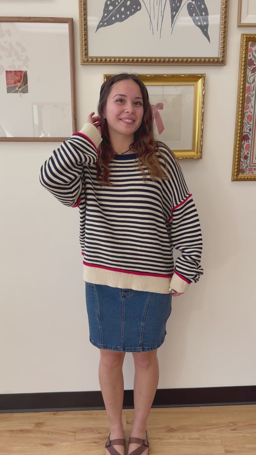 This cozy striped sweater is one of those easy throw-on pieces that still looks styled. The classic stripe pattern gets a fun update with contrast trim details and slightly relaxed sleeves, giving it that effortless, everyday feel. It’s lightweight enough for layering but still cozy enough to carry you through cooler mornings and evenings.
